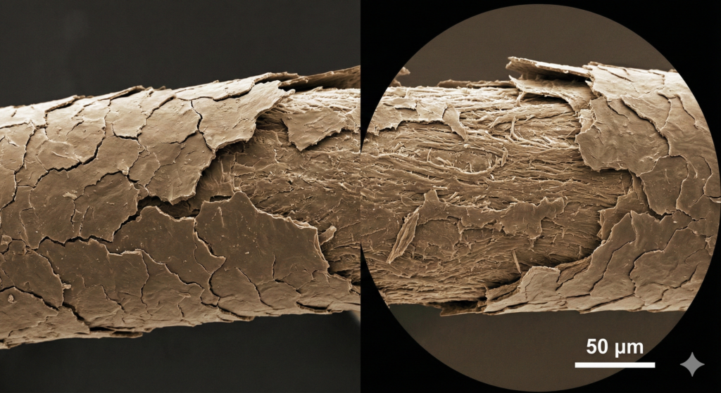 No caso das luzes e colorações, substâncias como amônia e peróxido de hidrogênio promovem a remoção da pigmentação natural por meio de um processo oxidativo intenso. Nesse processo, ocorre a quebra das ligações de dissulfeto, responsáveis pela elasticidade e força do cabelo. Com isso, os fios tornam-se mais porosos, ressecados e propensos à quebra — sinais clássicos de um cabelo danificado pela química.